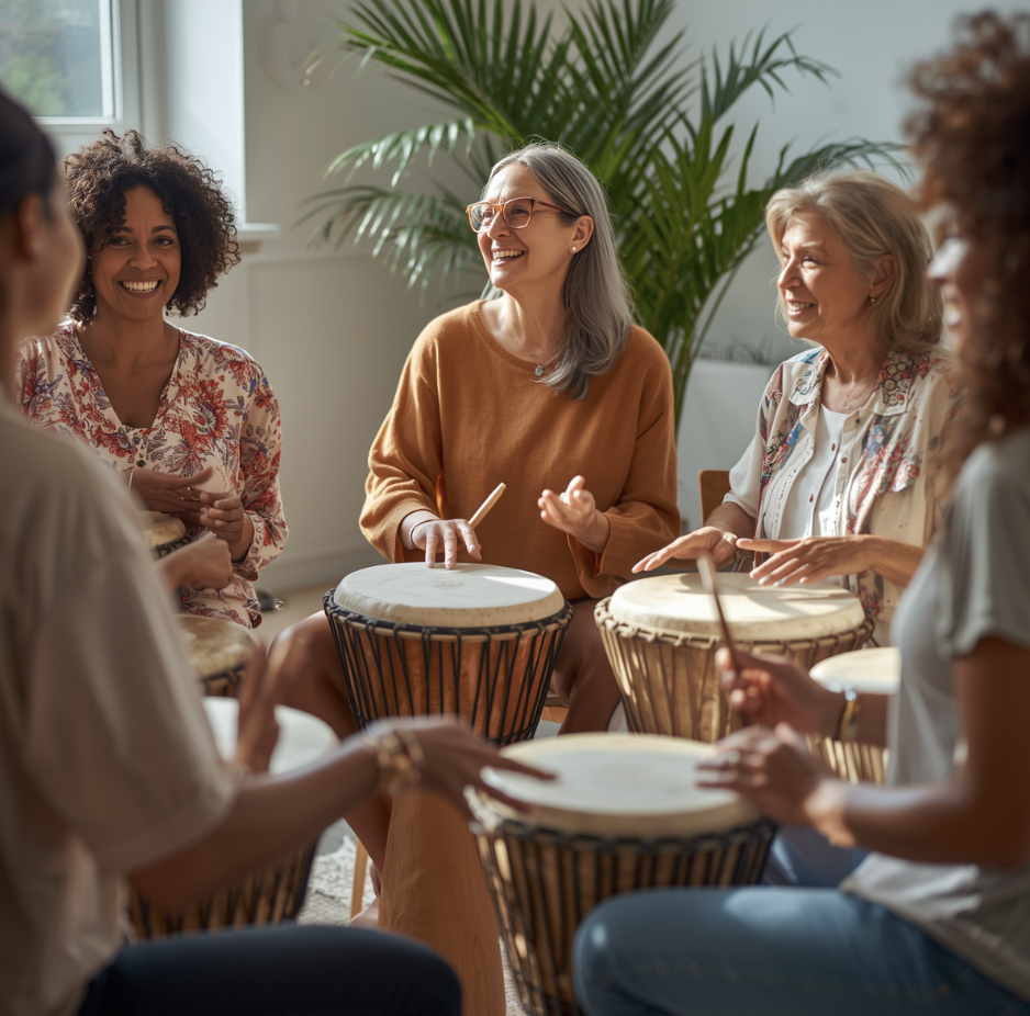 Group drumming (like our Delightful Drumming Circle), for example, has been linked to reduced stress, improved mood, and enhanced immune response (Bittman et al., 2001). Singing together, like with our Heart Song Circle can regulate breathing, stimulate the vagus nerve, and foster a deep sense of connection and belonging (Fancourt & Perkins, 2018).