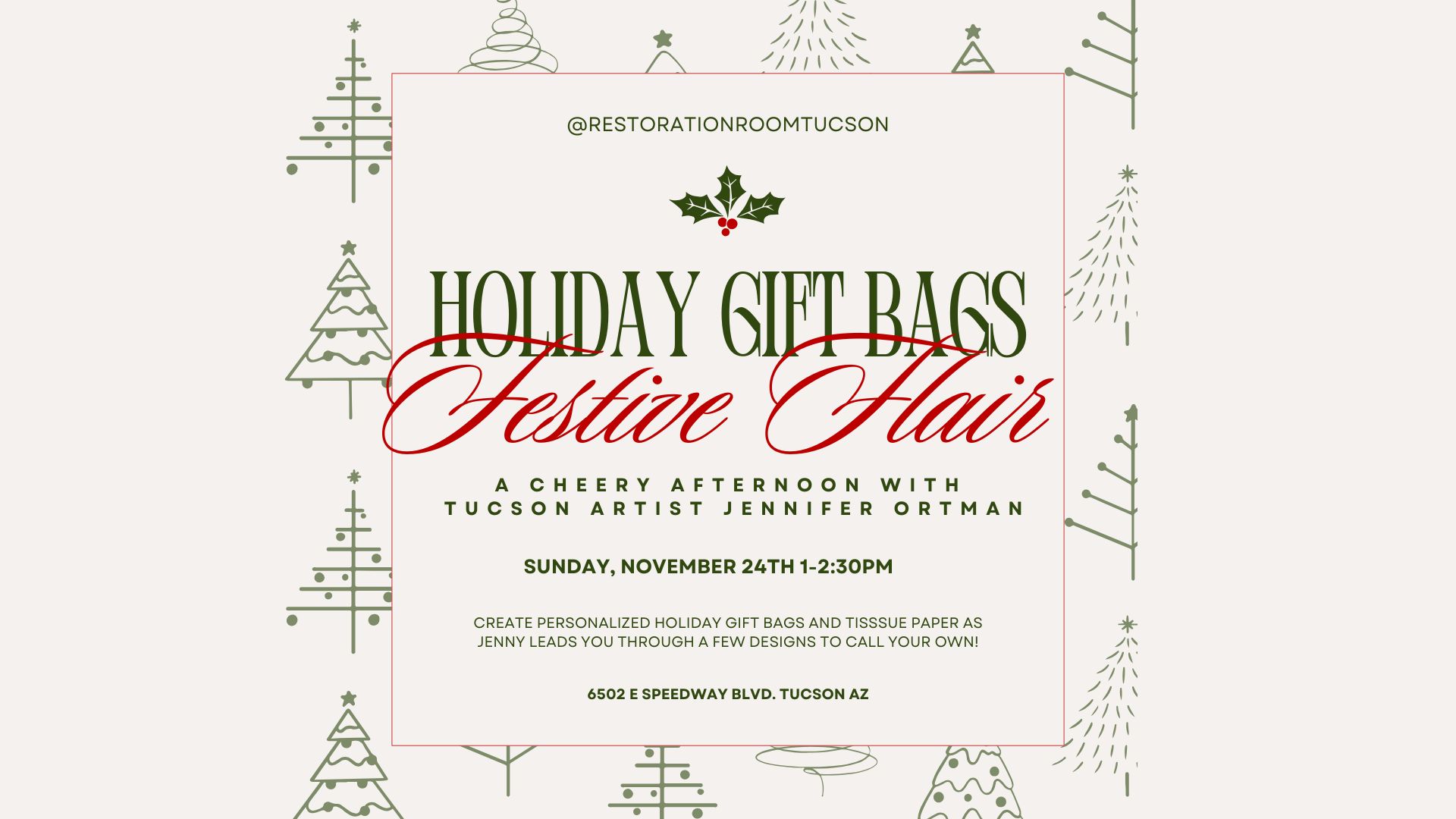 Join Tucson Artist Jennifer Ortman and Restoration Room’s Founder Nicole Vienneau for a fun and festive afternoon designing paper gift bags and dying tissue paper!